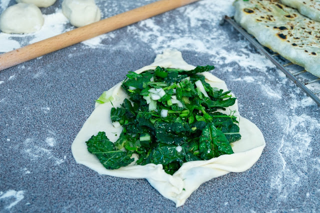 Dieses Gericht vereint einmal mehr, alles was ich liebe! Ganz viele verschiedene Kräuter getrocknet und frisch, unter anderem Petersilie, Minze, Thymian und Dill. Grünes Gemüse wie Spinat, Schwarzkohl, und Frühlingszwiebeln in Hülle und Fülle. Ein schneller und einfacher Teig nur aus Mehl, Wasser, Olivenöl und Salz. Und natürlich nicht zu vergessen eine Prise Chili für die nötige Schärfe. Aus diesen einfachen Grundzutaten habe ich mit viel «Grün» gefüllte armenische Fladenbrote gemacht, die nur so von Geschmack und Würze strotzen.